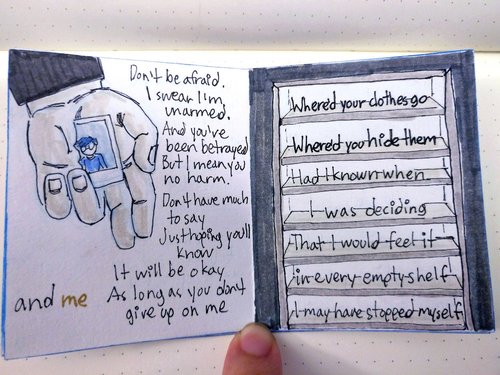 Handmade zine based on the album Some Feelings, given as a gift to its artist, Julia Nunes. Each page is based on and includes lyrics from a song from the album. Pages were made from folded blank index cards with the edges colored blue, 3-hole-stitched together with blue thread.